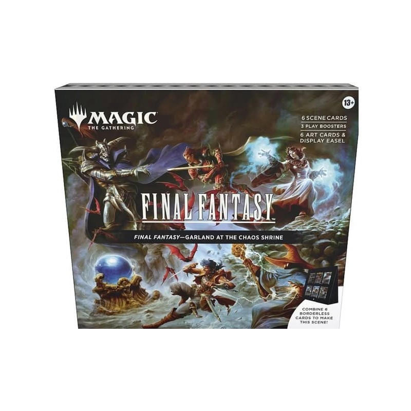 Esta caja de escena de Magic: The Gathering—FINAL FANTASY, Garland at the Chaos Shrine, contiene 6 cartas de escena foil tradicionales sin borde, 6 cartas de escena solo con ilustraciones, 3 sobres de juego y un caballete de cartón. Cada sobre de juego contiene 14 cartas de Magic: The Gathering, con una combinación de entre 1 y 4 cartas raras o de una rareza superior, entre 3 y 6 poco comunes, entre 6 y 9 comunes y 1 carta de tierra. Una carta de cualquier rareza es foil tradicional. La carta de tierra también es foil tradicional en el 20 % de los sobres de juego. Este producto no contiene una carta de chocobo dorado (solo disponible en los sobres de coleccionista en inglés).