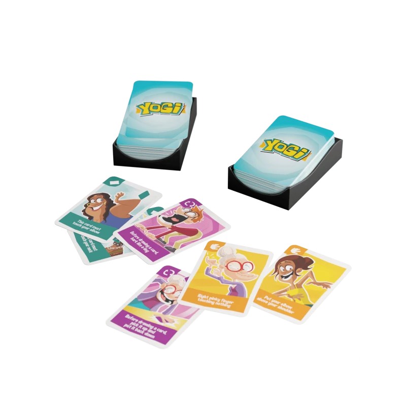 Yogi es un juego en donde tu y tus amigos deberán doblarse, contornearse y por supuesto reírse. En cada turno, debes sacar una carta que tiene una simple instrucción desde poner esa carta sobre tu cabeza o poner el dedo sobre tu nariz. Si un jugador no puede ir sumando todas estas acciones cada vez que toma una carta queda eliminado del juego.