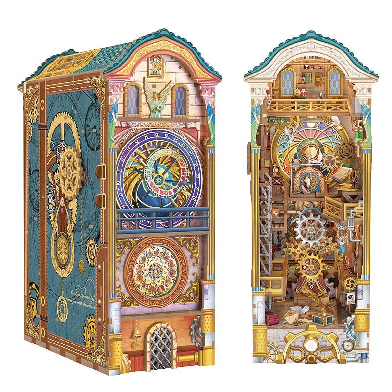 Atrévete a entrar en un rincón donde el tiempo late en miniatura. Este book nook recrea un misterioso reloj astronómico al estilo de Praga, con engranajes que giran, campanarios góticos y una plataforma que se eleva como si alguien la accionara para dar cuerda. Construir este mundo es armar un poema en madera: cada pieza encajada, cada mecanismo activado, te acerca al tic-tac de los recuerdos y te recuerda que el tiempo no solo pasa... también espera.