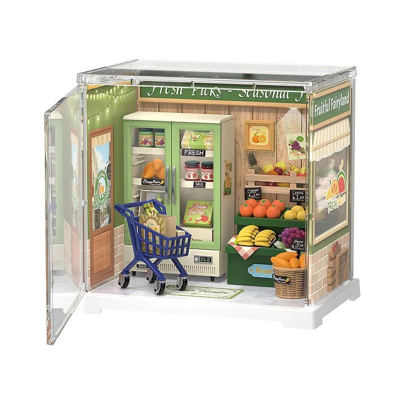 Un rincón frutal lleno de frescura, calma y buena vibra. Este diorama miniatura te lleva a una pequeña tienda de jugos naturales donde las frutas, las botellas y los detalles verdes se combinan para crear una atmósfera refrescante y llena de energía.