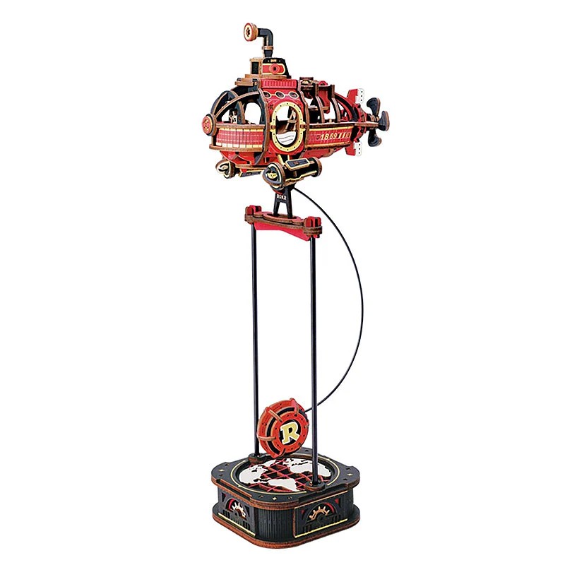 Un submarino retro que vuelve a surcar los abismos… esta vez sobre tu escritorio. Este modelo de madera te sumerge en la emoción de explorar el océano con estilo steampunk: al armarlos, las piezas se ensamblan como engranajes de un mecanismo antiguo hasta revelar una pequeña nave submarina que se mece como un péndulo.